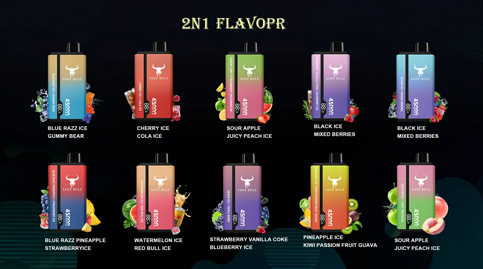 Dostępne kombinacje smakówLost Bulz V450 oferuje wyjątkowe połączenia smaków, które pozwalają odkrywać nowe aromaty.